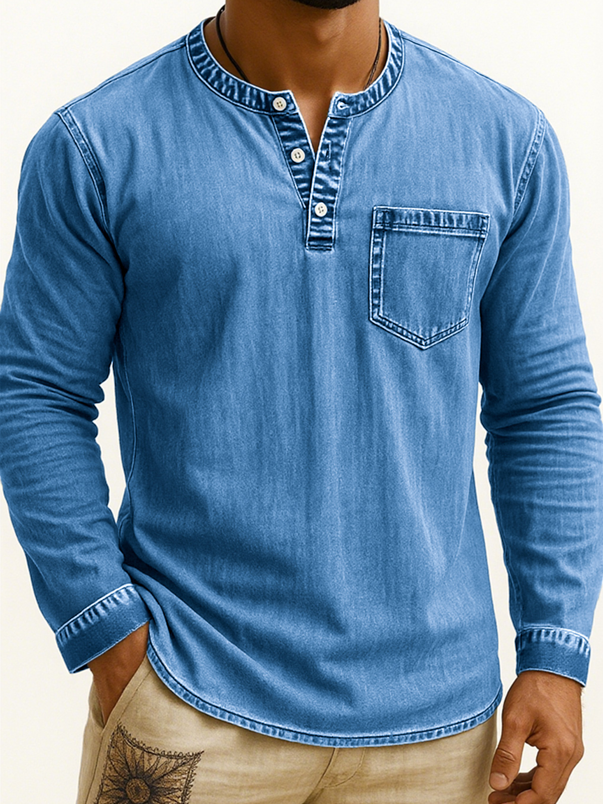 Herren-Henley-Hemd mit Retro-Stehkragen und Tasche, lässig, Used-Look, langärmelig