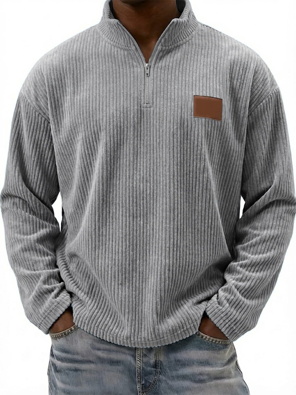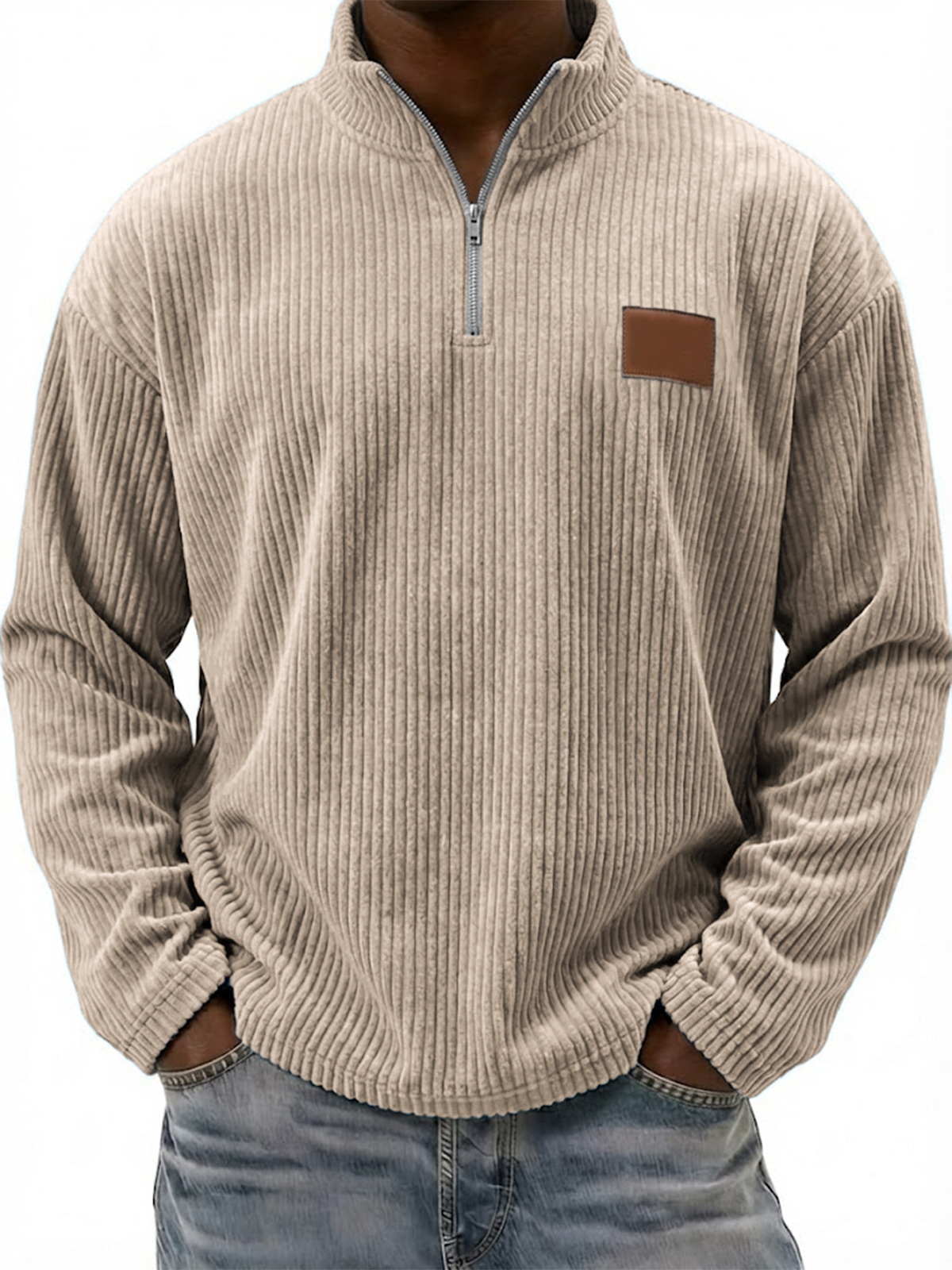 Vintage Cord-Poloshirt für Herren mit Viertelreißverschluss stylischer Patchwork-Stickerei und Stehkragen