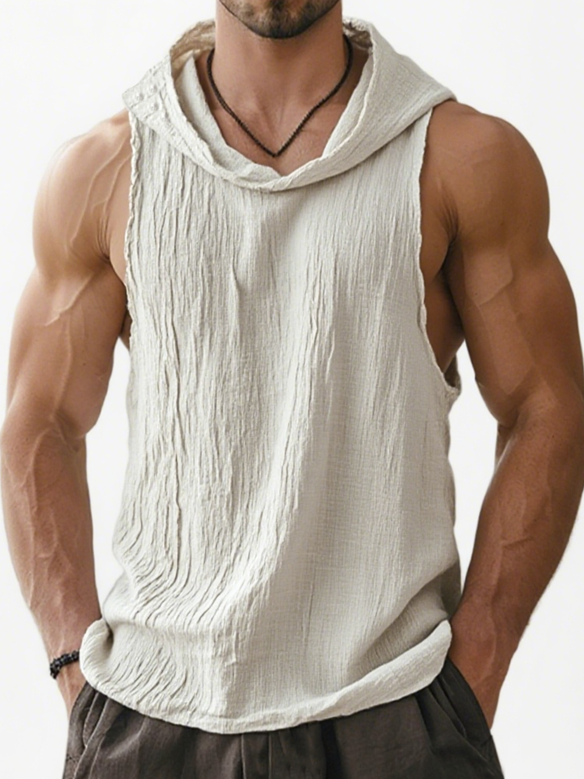 Bequemes Herren-Henley-Shirt aus sonnenbeständigem Leinen mit Kordelzug und Kapuze, ärmellos