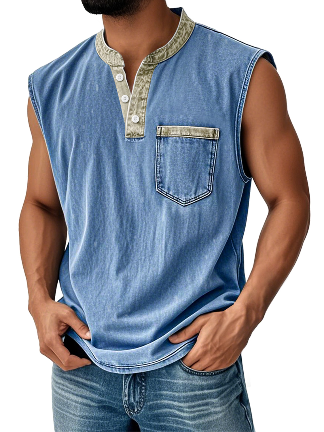Herrenmode Retro Distressed Stehkragen Tasche Ärmelloses Henley-Shirt