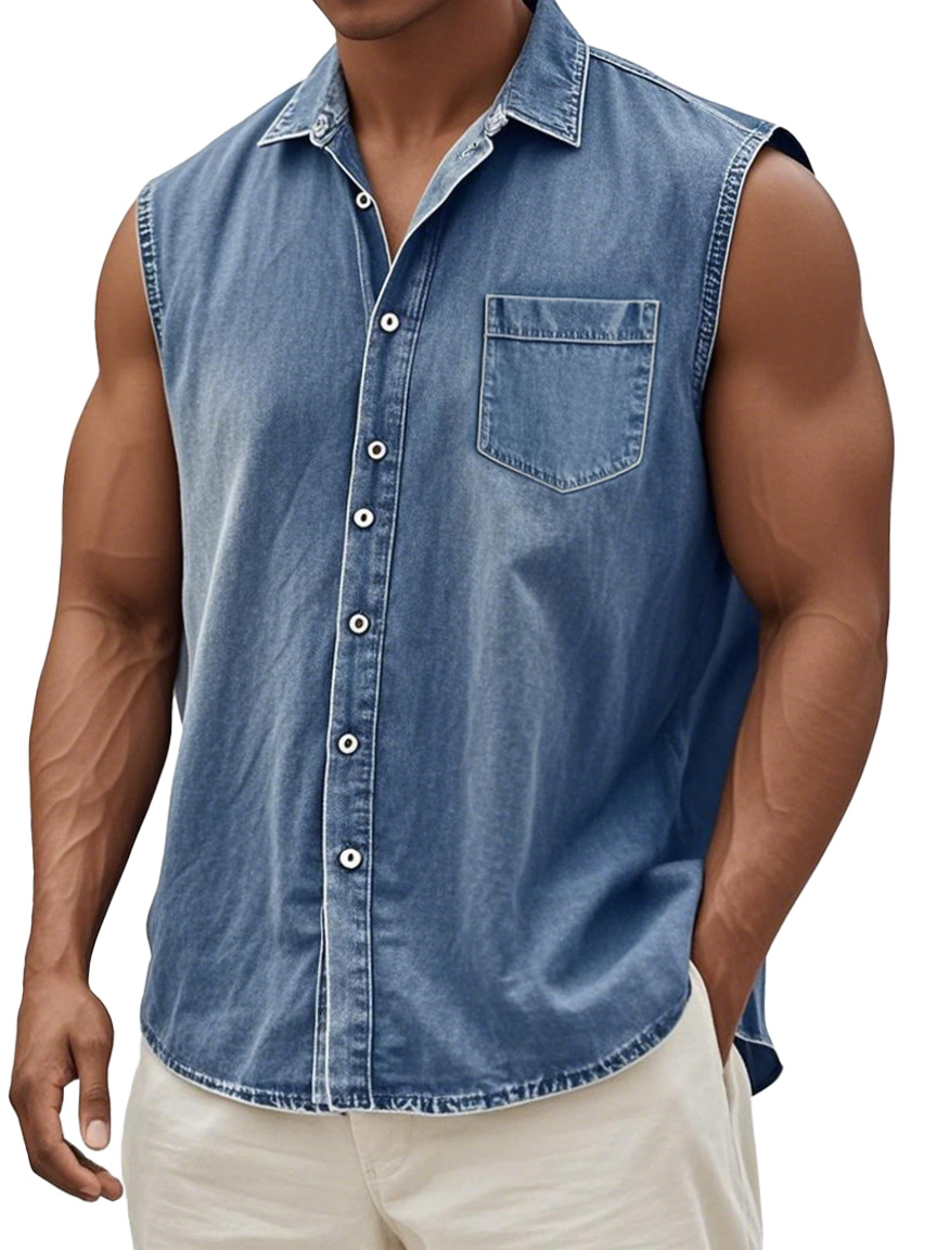 Herren Vintage Alltagshemd mit Revers und Tasche, lässig, ärmellos