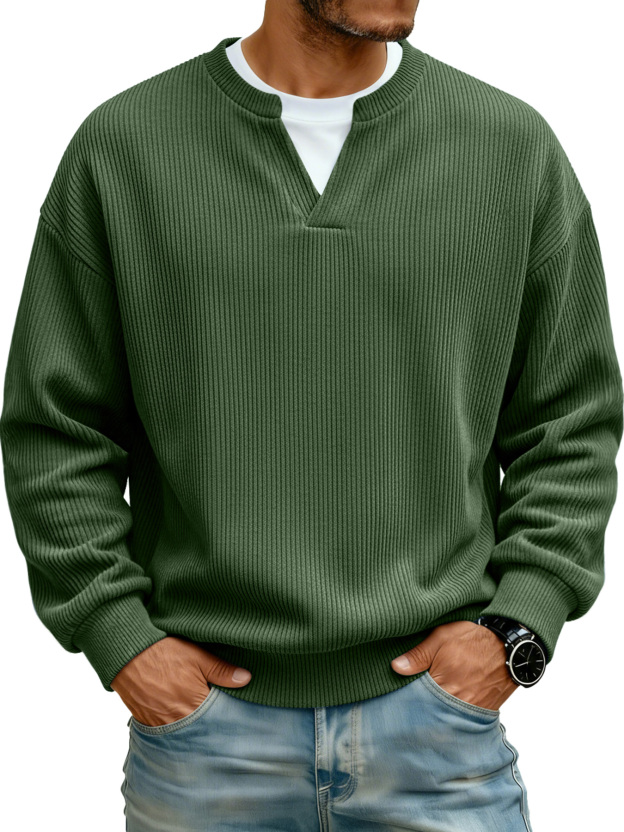 Men's Ribbed V-neck Faux Two-Piece Casual Long-Sleeve T-Shirt
